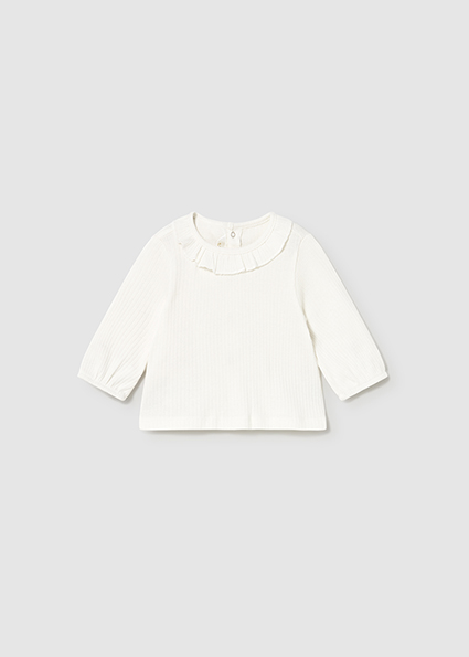 Camiseta de manga larga para recién nacido. Cuello redondo con volante. Cierre con botones a presión en la parte posterior.