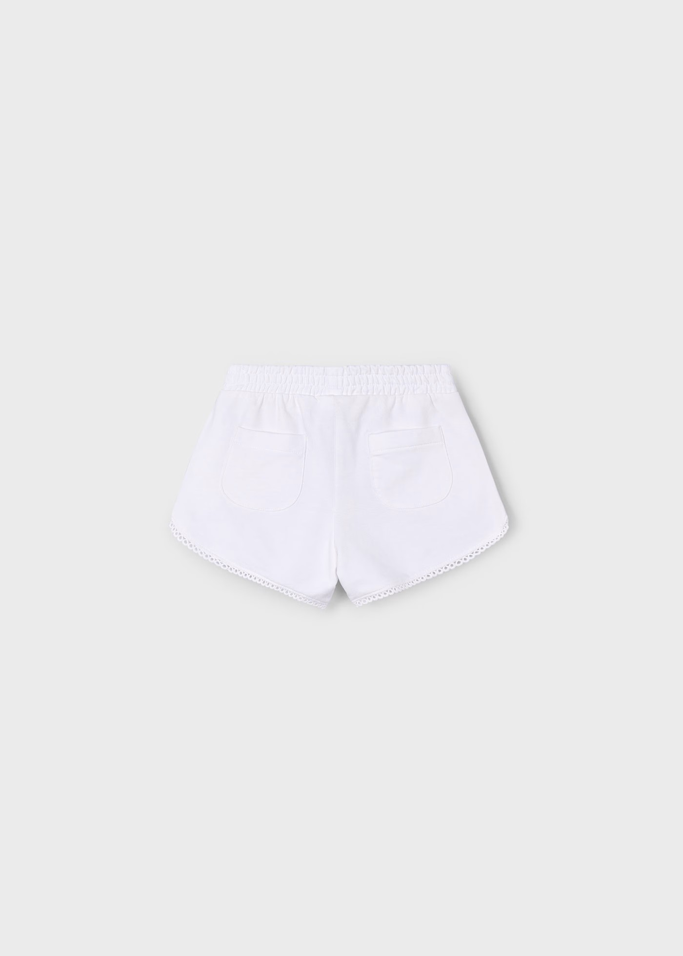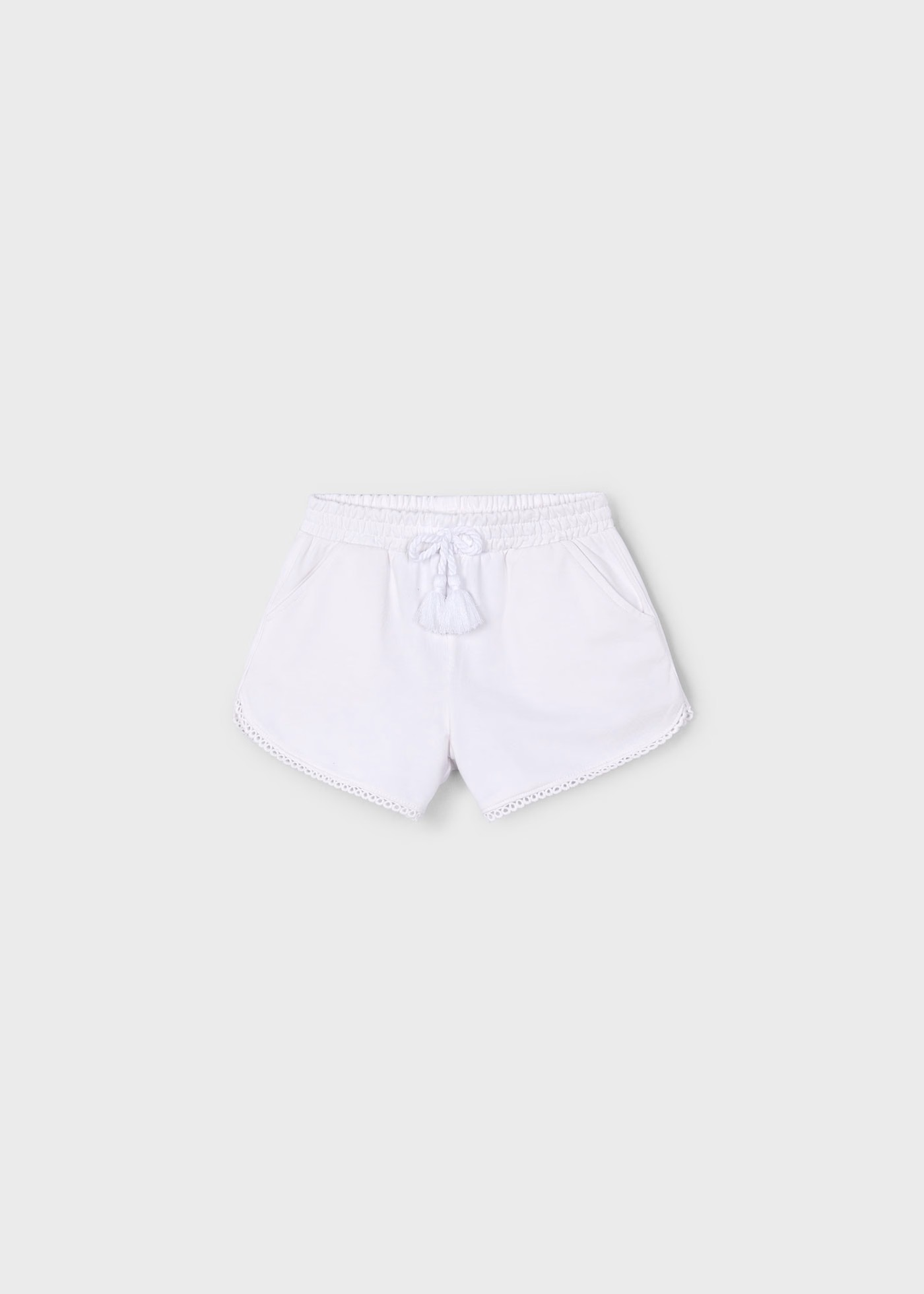 Pantalón corto para niña. Cinturilla elástica. Suave tejido de algodón elástico. Elementos de adorno: lazo.